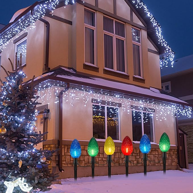 • Connectable Christmas Walkway Lights: Each set of 7ft multicolor C9 led Christmas lights outdoor 2.4 watts, can connect up to 180 sets of outdoor Christmas patio decorative walking path lights (maximum 432 watts). Plug in the Christmas pathway lights and enjoy, the jumbo colorful C9 christmas bulb pathway stakes lights make them stand out at night, bring more warm and charming atmosphere for the Christmas holiday.