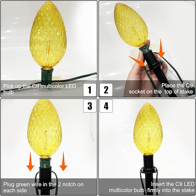 • Safe and Energy Efficient: The Christmas sidewalk lights with 8 C9 colored LED bulbs that are UL certified for interior and exterior decoration and lighting. E17/C9 candlestick socket base If the light bulb goes out, it will not affect other light bulbs.