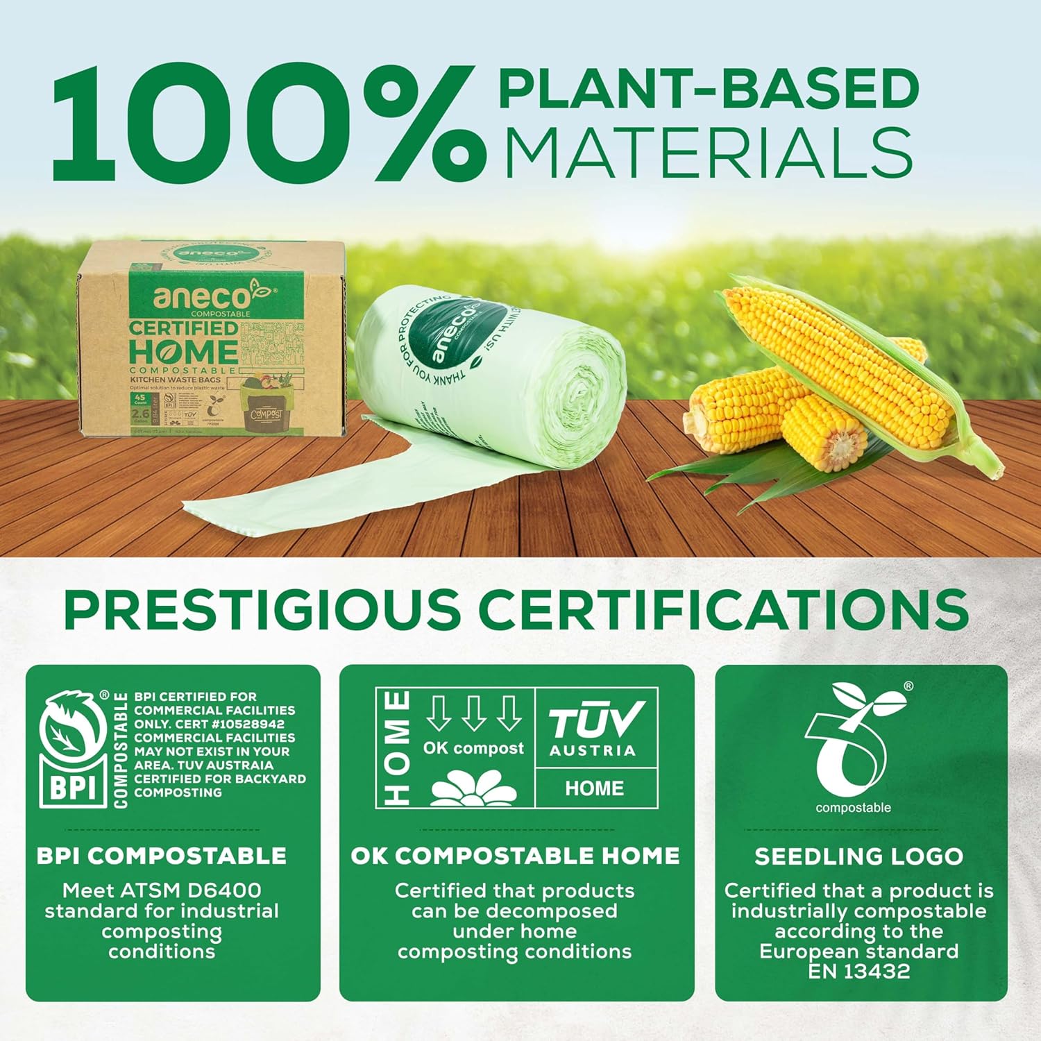 • 🍀 Made from entirely renewable resources such as corn starch and plant-based materials, ANECO compostable bags 2.6 gallon decomposes naturally into CO2, water and organic biomass within one year, leaving no traces of plastic in the environment. It also meets strict standards and earned prestigious certification from BPI Compostable (US standard ASTM D6400), TUV Austria (OK Compost Home) and European Bioplastics (Seedling Logo) so you can totally buy with confidence.