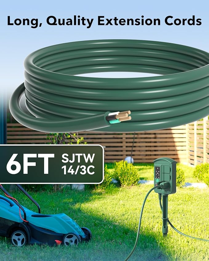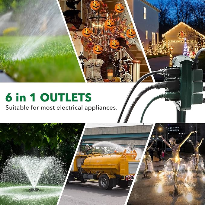• Weatherproof & Safe: Designed for outdoor use, each outlet has a protective cover to shield it from water, dust, and debris. Please fully insert the plug when using and unplug before cleaning.