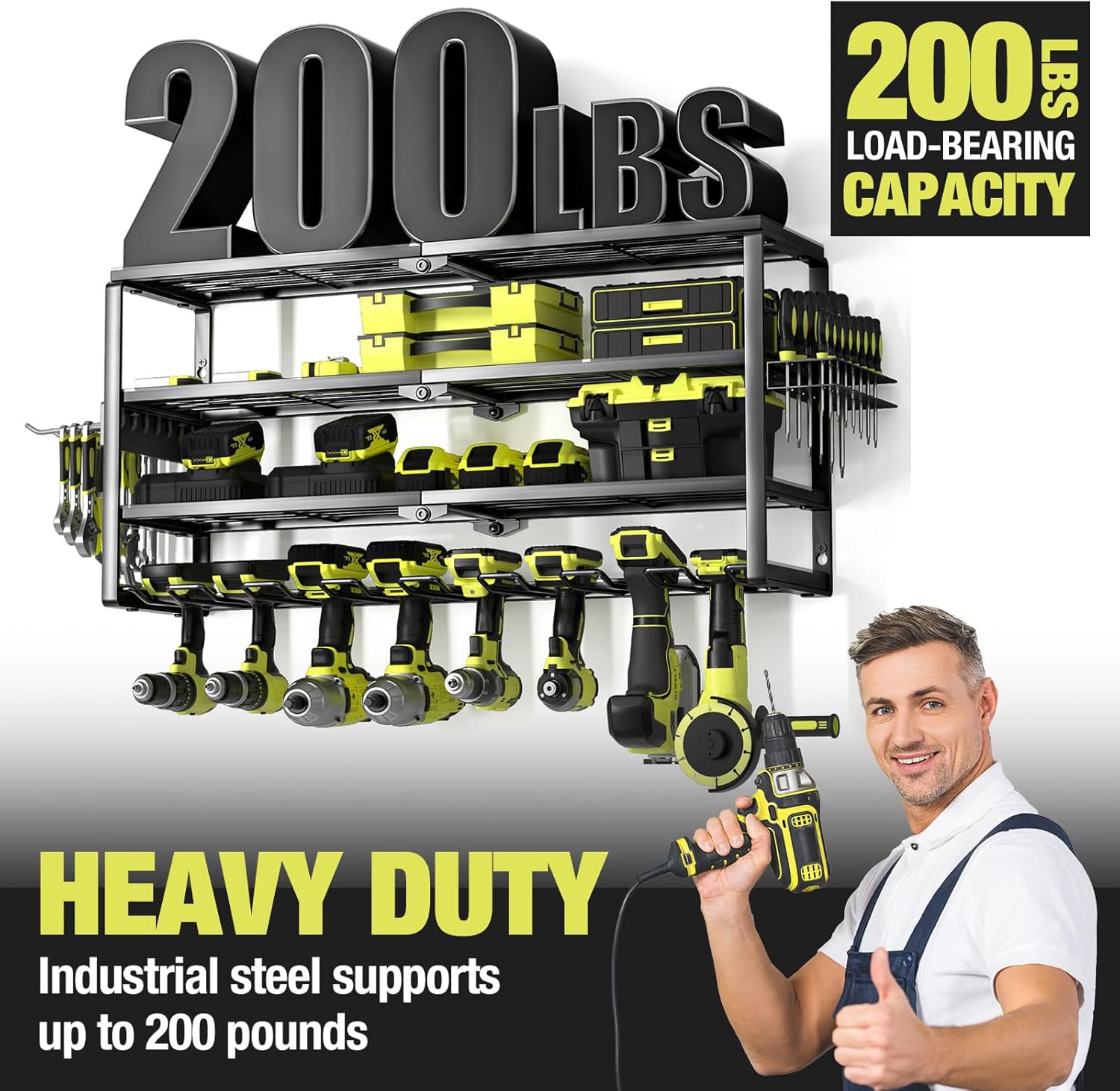 • 【HEAVY DUTY & DURABLE】:This tool hanger is made of heavy compact steel metal, with plenty of load-bearing testing, our storage rack can hold your power tools of any weight. The durable black powder coating prevents rusting and lasts a lifetime