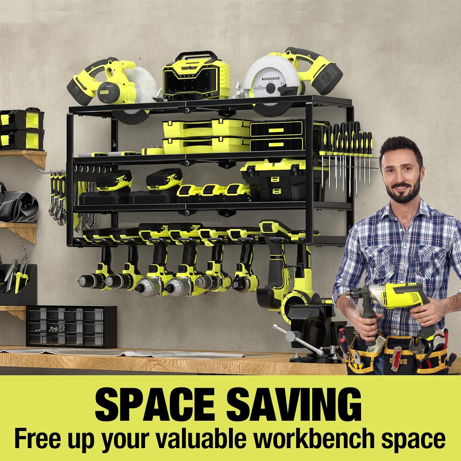 • 【4 - LAYER DESIGN】4 layer design of the tool rack allows you to better sort your tools. The height of the middle shelf is 5.1'', which is enough to place the charger. Drill rack's 1.7" wide slot and 2.2" slot spacing fit most power tools