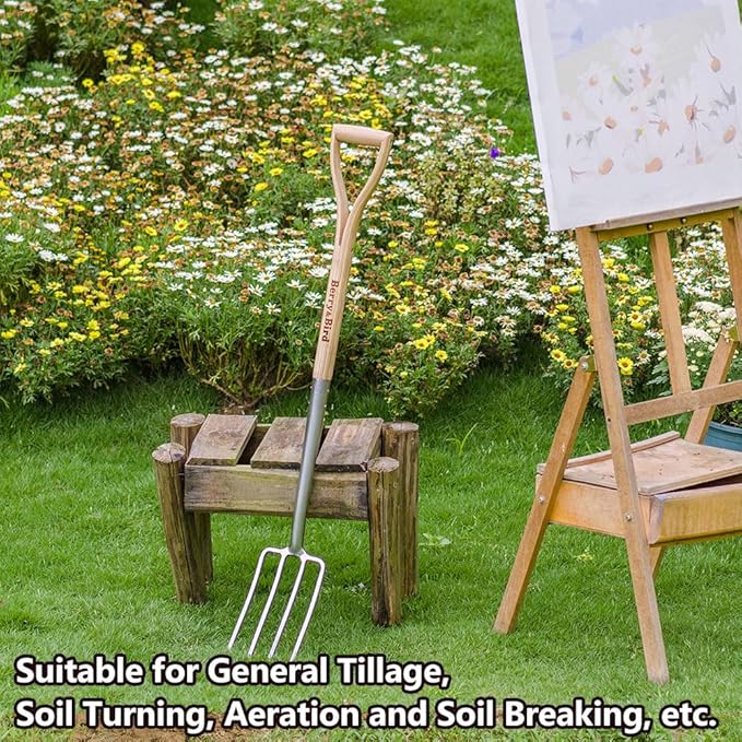 Berry&Bird Garden Digging Fork, 37.4" Stainless Steel Garden Spading Fork with D-Grip Handle, 4-Tine Heavy Duty Long Handled Pitchfork with Ash Wood Handle for Digging, Planting, Cultivating, Aerating