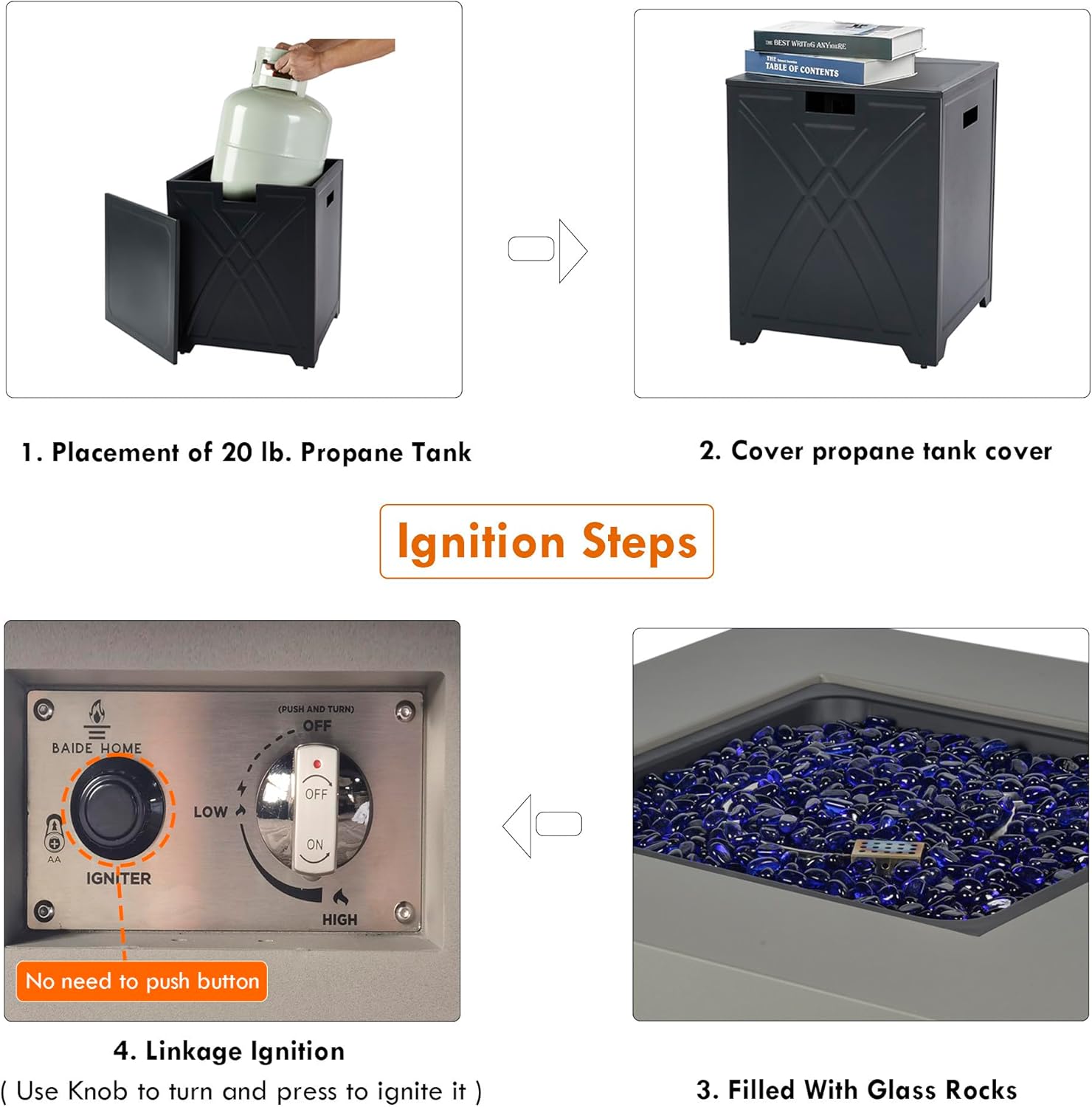 • Boasting a robust 50,000 BTU heat output, this outdoor gas fire pit provides powerful and effective warmth. It features electronic ignition and a flame control knob that allows you to adjust the flame size from low to high. Utilize a standard 20 lb propane gas tank (Tank not included).
