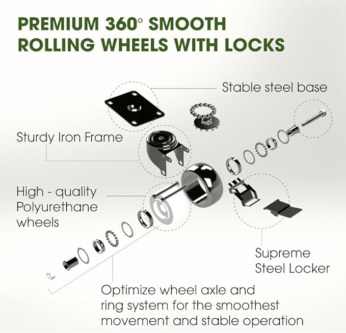 • UNIQUE 360 DEGREES ROLLING WHEELS WITH LOCKS: Equipped with durable 360-degree rotating Polyurethane wheels, our plant caddy glides smoothly on any surface, from carpet to soil; The locking mechanism ensures your pots for plants stay securely in place