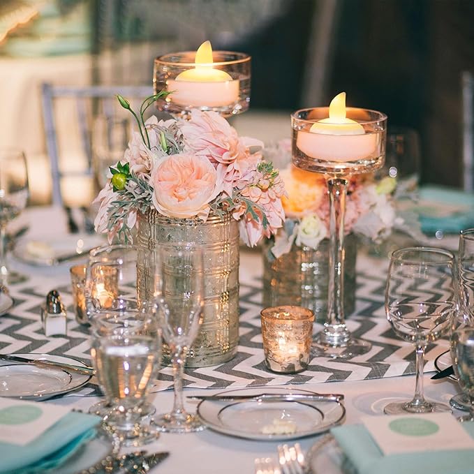 • 【Versatile floating candles】Use tall or short glass cylinder vases, bowls, goblets, mason jars, or cocktail glasses as candle holders and adorn them with faux rose petals, blue or gold faux pearls, gel beads, crystals, artificial ice cubes, or LED fairy lights. These bulk flameless flickering tealights are ideal for wedding centerpieces, parties, baths, restaurants, Christmas dinners, and Halloween decorations.