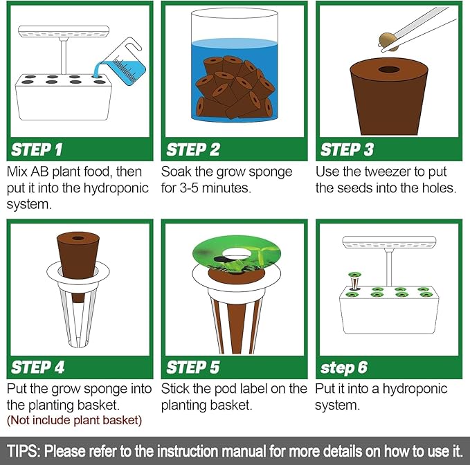 • Easy to Use: You simply mix AB plant food with water in the correct proportions and pour it into the hydroponic system, place the plants into the growing sponge(please soak the grow sponge for 3-5 minutes before use), then put the sponge into the grow basket, and finally place into the hydroponic system. [Please refer to the instruction manual for more usage methods.]