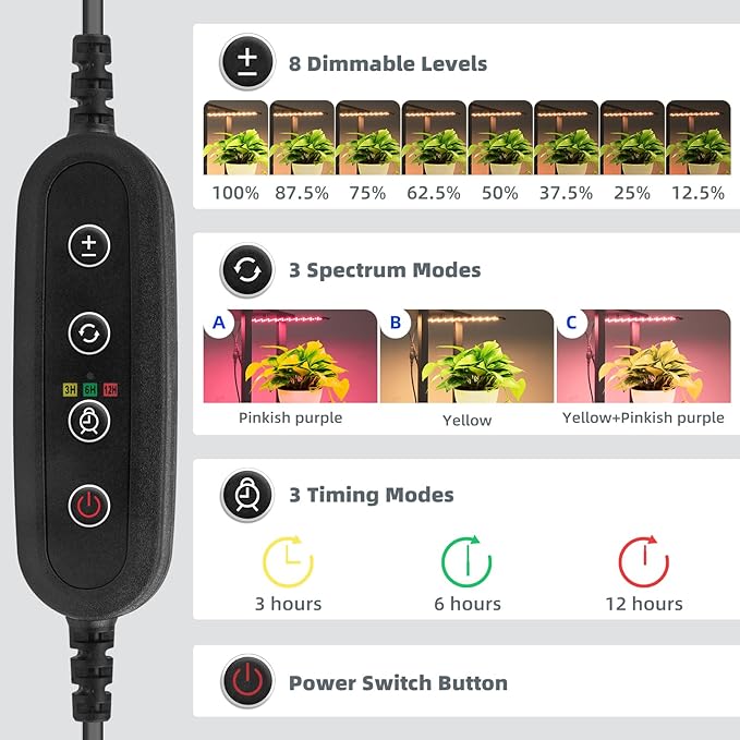 • Time It Right: With a built-in timer offering 3/6/12 hours and will automatically turn on and off at the same time the next day, no need to unplug/re-plug, you can effortlessly manage your plant's lighting schedule