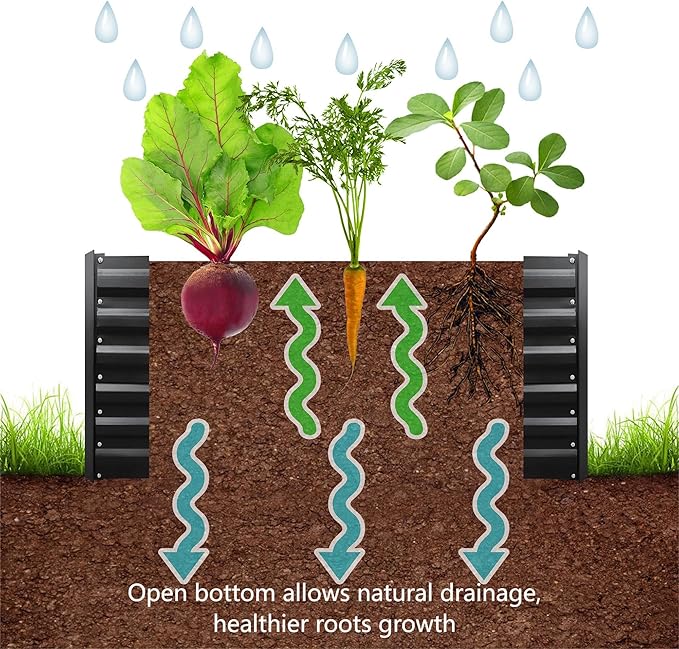 • OPEN BOTTOM: Sits on the ground garden bed, allows natural drainage, prevent waterlogging and root rot. It encourages the plants’ roots to grow deep into the ground, promoting stronger and healthier plants.