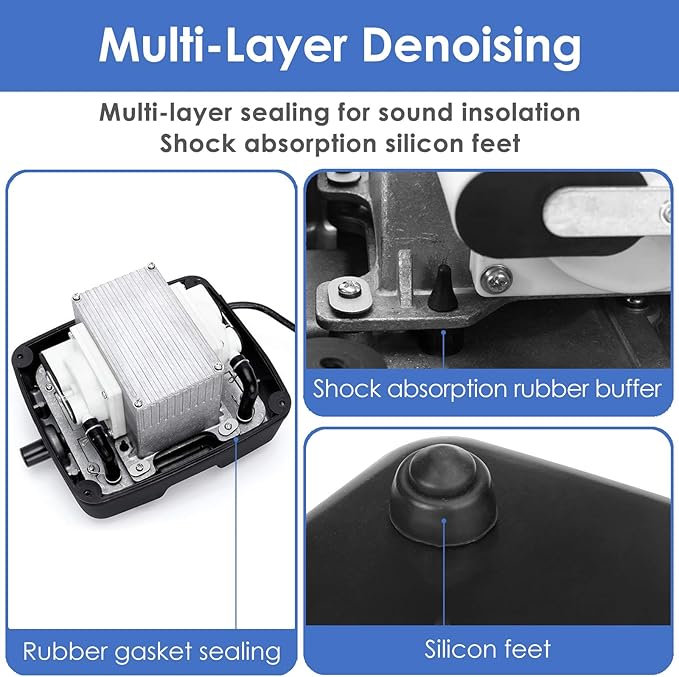 • QUIET – This linear air pump is designed with multiple layers of denoising to achieve low noise operation – Enlarged surface of the housing, perfect sealing of air chamber, widely used rubber and silicone buffer, most importantly the suspending magnetic-driven diaphragm.