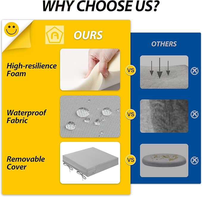 • Wide Use & Tips: These outdoor dining chair cushions fit pools, patios, balconies, decks, backyards, and gazebos. Foam inserts and covers are packed separately in bags and placed in one box—check all parts. Easy assembly required