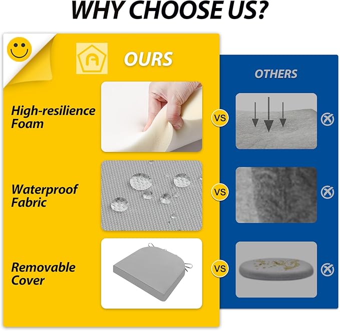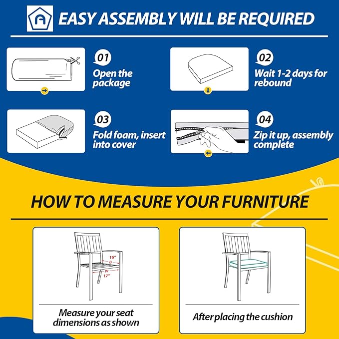 • Wide Use & Tips: These outdoor dining chair cushions fit pools, patios, balconies, decks, backyards, and gazebos. Foam inserts and covers are packed separately in bags and placed in one box—check all parts. Easy assembly required