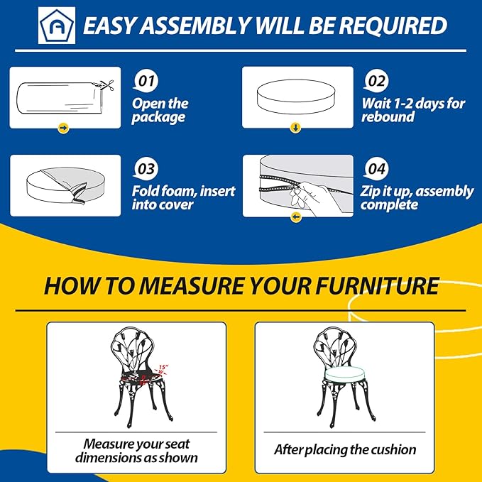 • Wide Use & Tips: These outdoor dining chair cushions fit pools, patios, balconies, decks, backyards, and gazebos. Foam inserts and covers are packed separately in bags and placed in one box—check all parts. Easy assembly required