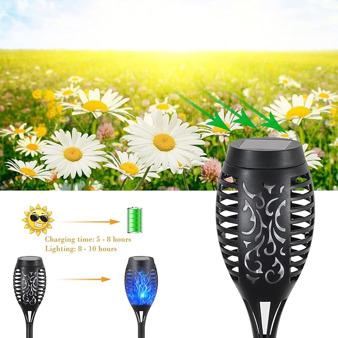 • Solar-Powered Outdoor Lights: Equipped with a solar panel, FAISHILAN solar torches can work for up to 6-8 hours in summer and 4-6 hours in winter after being fully charged. FAISHILAN solar-powered outdoor lights will provide vivid and dancing outdoor decor for gardens, patios, parties, camping, BBQs, and holidays