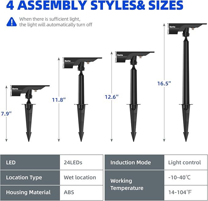 • 4 Assembly Styles and Size: With specially designed ground stake, you can easily assemble at different heights to suit your current needs to insert the spot lights into the ground as landscape spotlights.Perfect for patio, porch, deck, pool, yard, garden, garage, driveway, pathway, etc