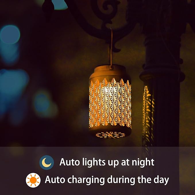 • Imaginative Garden Decor - Eandisom Outdoor Solar Lanterns are crafted from upgraded Sturdy metal, The retro appearance, with gold copper color and hollow out metal veneer, gorgeous color, casts bright and warm light in darkness, accompanied by gorgeous and graceful patterns, adding a beautiful atmosphere to the surrounding environment. Add illuminated charm to a garden, patio, porch and outdoor tabletop with these solar lantern lights. Make your outdoor spaces unique and amazing.