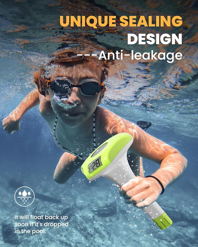 • 🍅UPGRADED IPX8 WATERPROOF: Our pool thermometer has been upgraded to IPX8 waterproof rating, specially crafted to stop rust, fogging, malfunction, and dirt buildup, keeping out water, snow, dust, and sand, thus maximizing the life of the pool thermometer.
