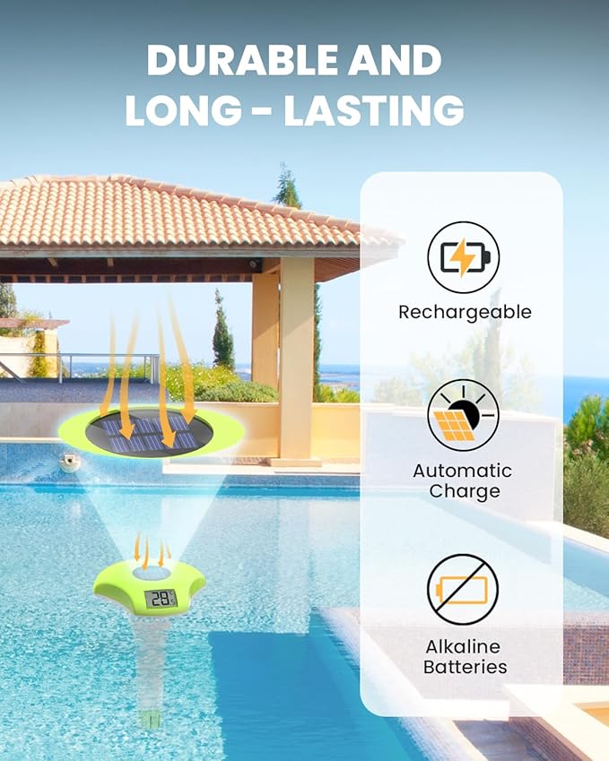 • 🍋DURABLE AND LONG-LASTING: Featuring a built-in lithium battery and solar panel, our solar-powered pool thermometer is rechargeable and easy to use. Simply place it in an area with ample daylight for automatic charging-eliminating the need for alkaline battery replacements.