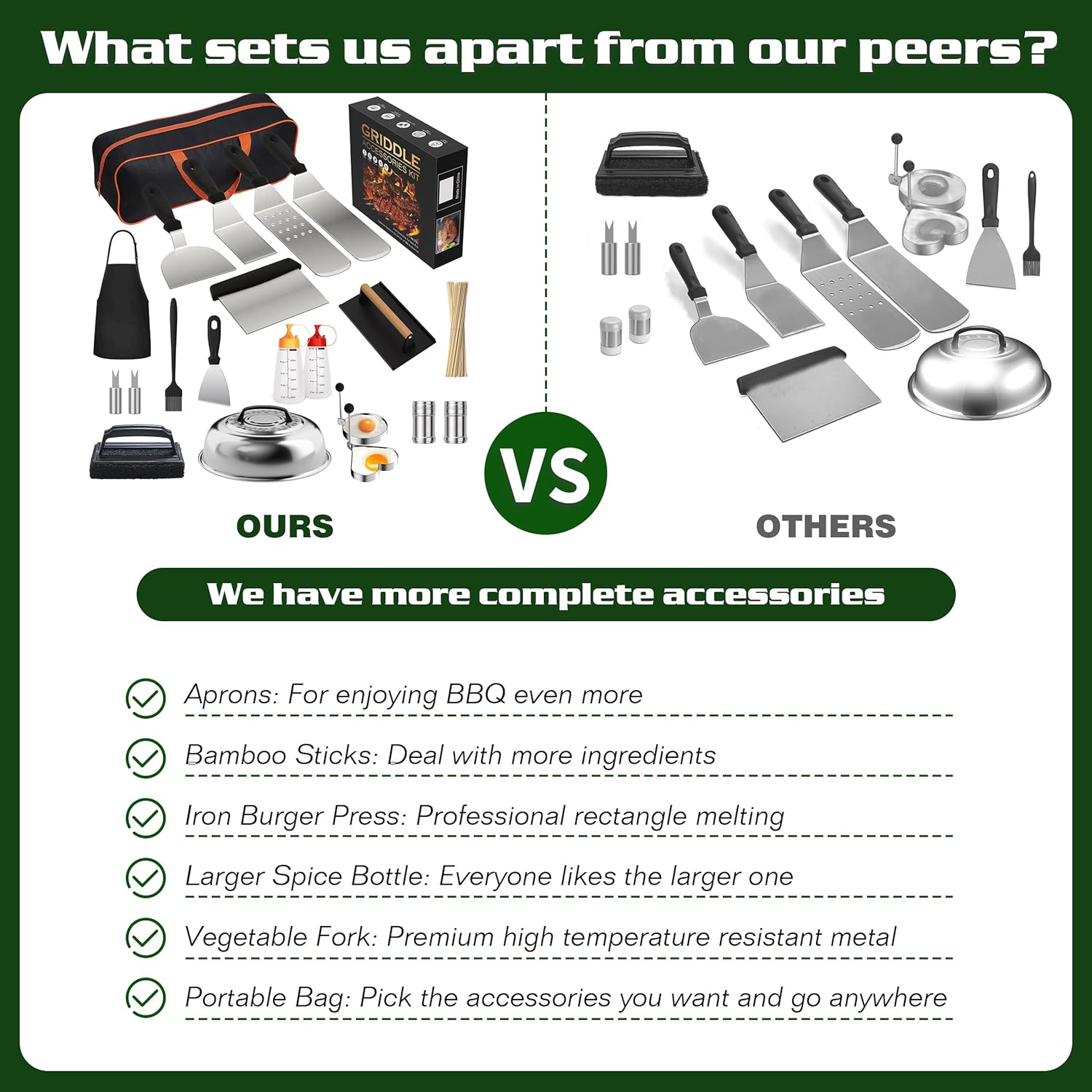 • 【Premium Quality】: Our Furnhome 120pcs Griddle Accessories Kit is crafted with heavy gauge stainless steel, ensuring durability and long-lasting performance. You can trust that our BPA-free, rust-resistant, and durable tools won't crack or melt with long-term use. Say goodbye to flimsy tools that bend or break easily during outdoor grilling sessions.