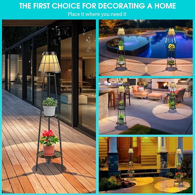• Innovative Solar Street Light:Unlike traditional solar floor lamps, our 45.5-inch solar pathway light features a groundbreaking double-tier plant shelf concept. This innovative design allows you to display your favorite plants or books, tools, etc. to add a refreshing touch of nature or culture to your outdoor garden, yard, patio.
