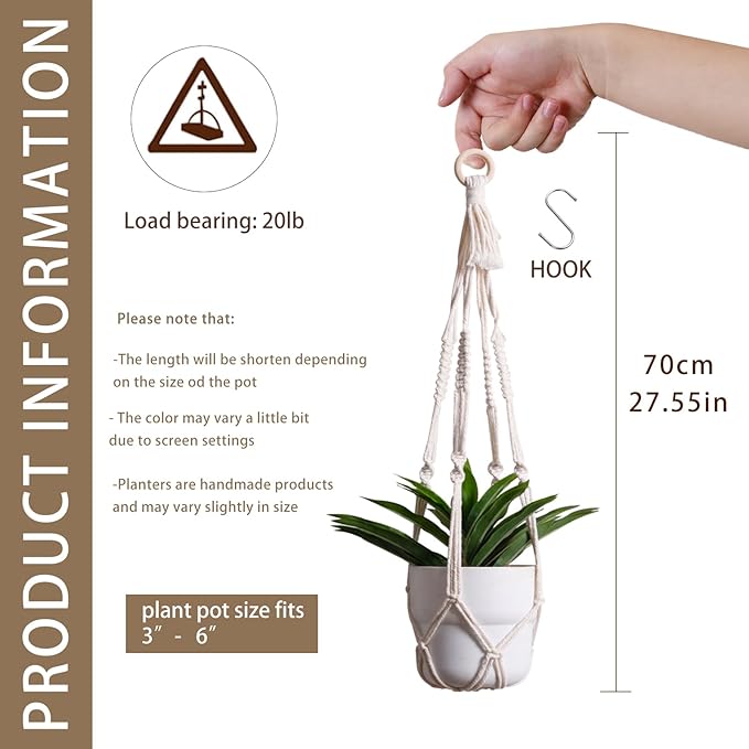 • EASY TO HANG ANY SPACE - Macrame plant hanger with no tassel for indoor and outdoor use, simply place the pot in the bottom, you can hang them in your living room, hall, pathway, office ceiling and anywhere you like. Kid and pet can no longer mess up your potted plant