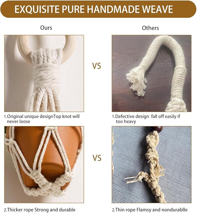 • HANDMADE WEAVING CRAFT - Hanging plant holder made from eco-friendly cotton rope and woodedl ring, It has a strong flexible woven design, sturdy and durable, enough to hold the weight of the pots, not easy to break, you can take them home for your plants with confidence