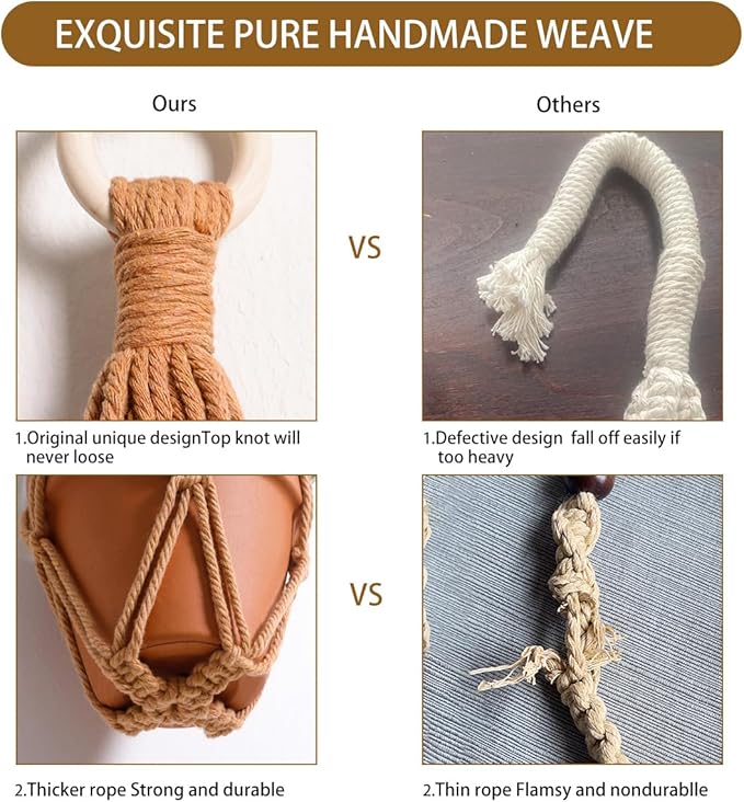 • HANDMADE WEAVING CRAFT - Hanging plant holder made from eco-friendly cotton rope and woodedl ring, It has a strong flexible woven design, sturdy and durable, enough to hold the weight of the pots, not easy to break, you can take them home for your plants with confidence