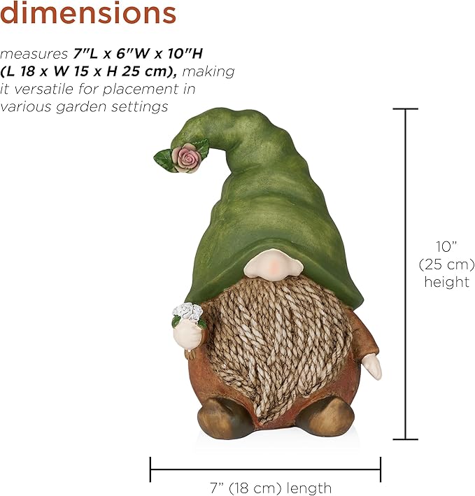 • PERFECT DIMENSIONS: With measurements of 7"L x 6"W x 10"H, this gnome statuary is a compact yet eye-catching feature for your outdoor space