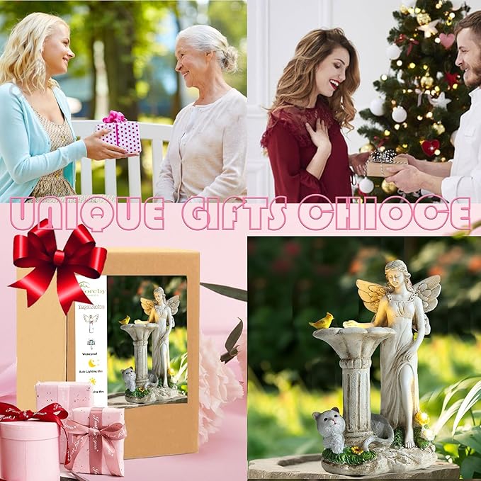 • 🌟【Original Outdoor Angel Staues 】Elegant Angel sculpture with a solar bird bath and a cozy cat sleeping beside .This garden angel statue ,with its eye-catching presence, adds a touch of whimsy and vitality to your outdoor space.