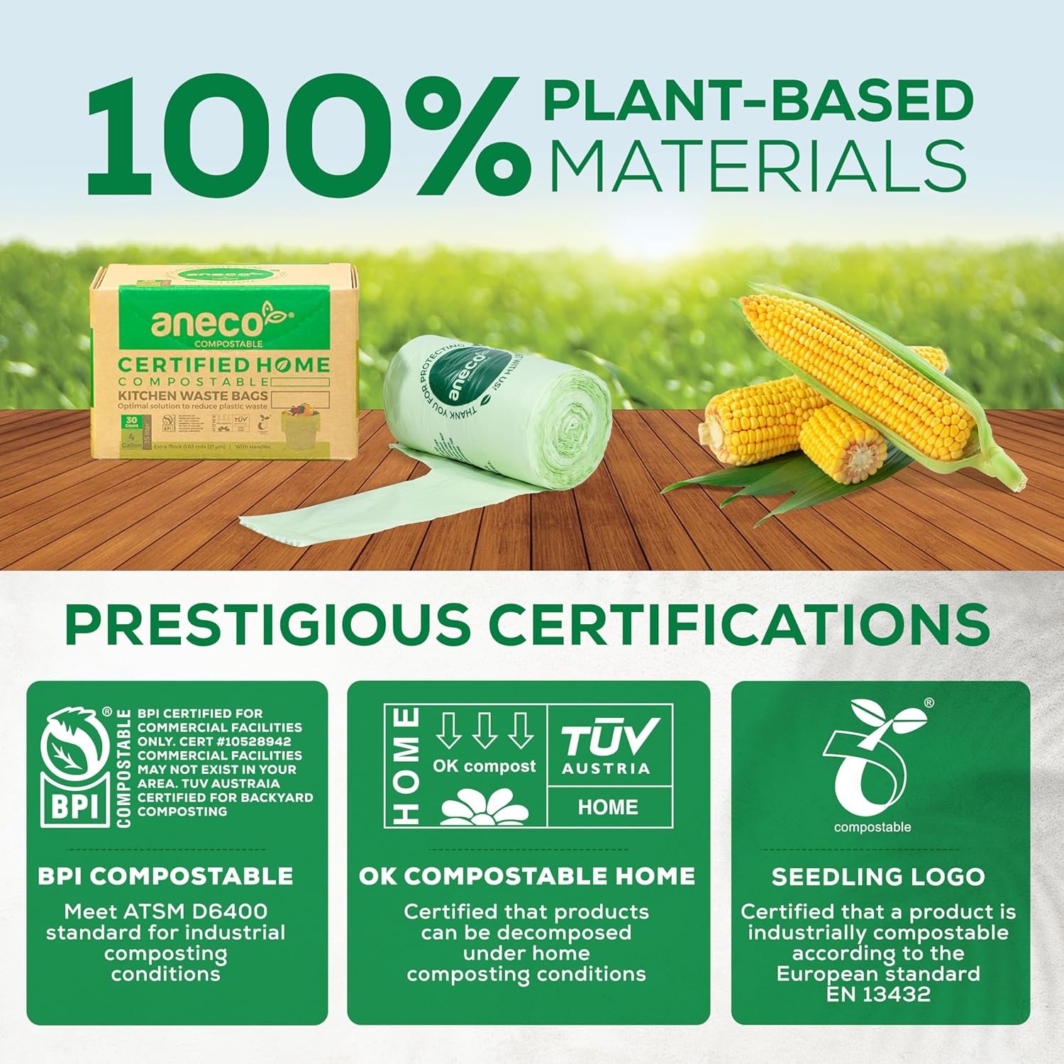 • 🍀 𝐒𝐮𝐬𝐭𝐚𝐢𝐧𝐚𝐛𝐥𝐞 & 𝐍𝐚𝐭𝐮𝐫𝐚𝐥𝐥𝐲: Made from renewable resources like corn starch and plant-based materials, ANECO compost bags for countertop bin decompose naturally into CO2, water, and biomass within a year, leaving no harmful traces. Prestigious certifications from BPI Compostable (US standard ASTM D6400), TUV Austria (OK Compost Home), and European Bioplastics (Seedling Logo) guarantee their eco-friendliness.