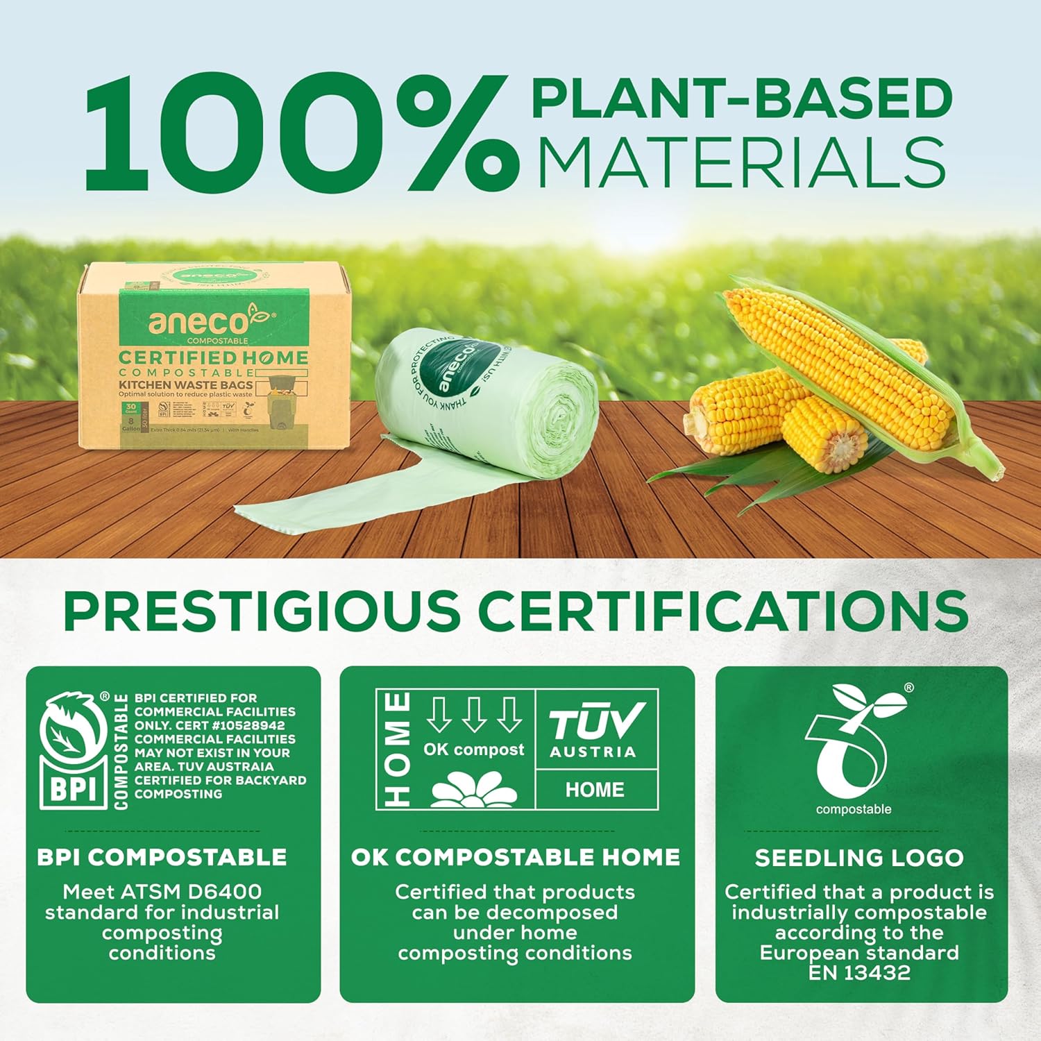 • 🍀 𝐒𝐮𝐬𝐭𝐚𝐢𝐧𝐚𝐛𝐥𝐞 & 𝐍𝐚𝐭𝐮𝐫𝐚𝐥𝐥𝐲: Made from renewable resources like corn starch and plant-based materials, ANECO 8 gallon garbage bags decompose naturally into CO2, water, and biomass within a year, leaving no harmful traces. Prestigious certifications from BPI Compostable (US standard ASTM D6400), TUV Austria (OK Compost Home), and European Bioplastics (Seedling Logo) guarantee their eco-friendliness.