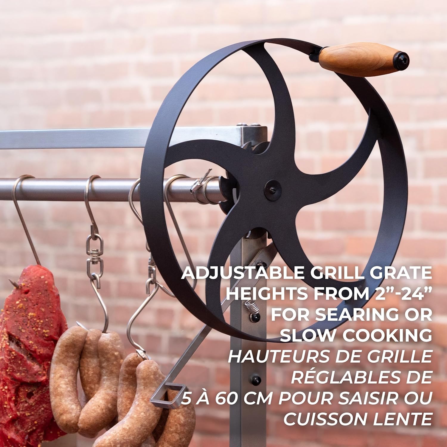 • Santa Maria Precision: Grill grates adjust from 2” to 24” in height, giving you perfect control for searing or slow roasting meats to perfection