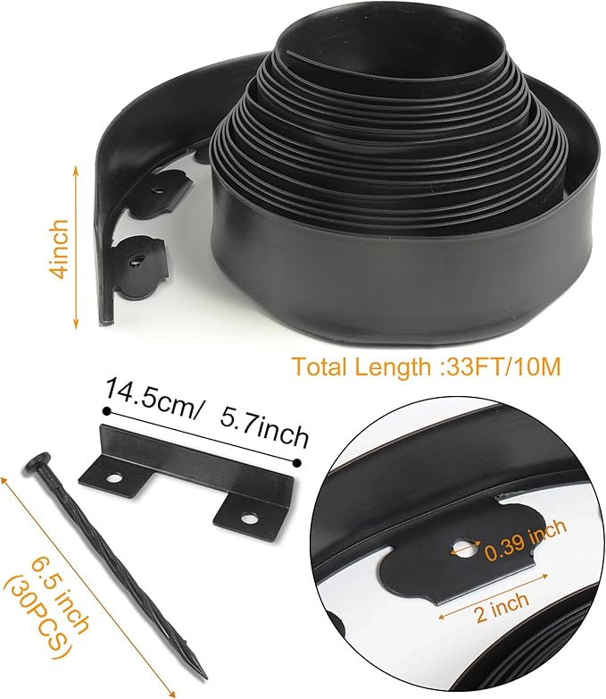 • What You Get: The border edging kit includes one roll of 33 ft length, 4 inch height black plastic lawn edging for effective landscaping, and 30 pegs measuring 16.5 cm in length to assist in maintaining its shape