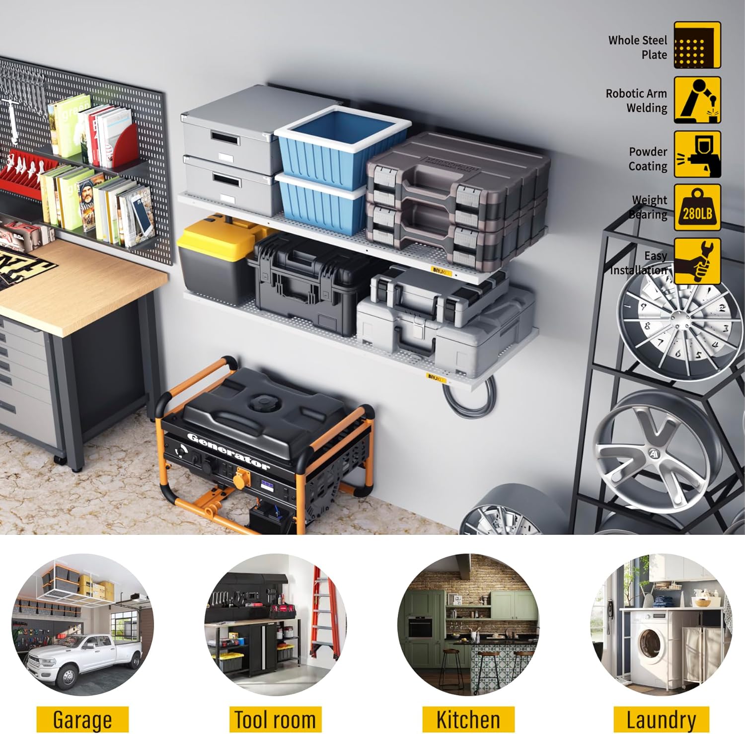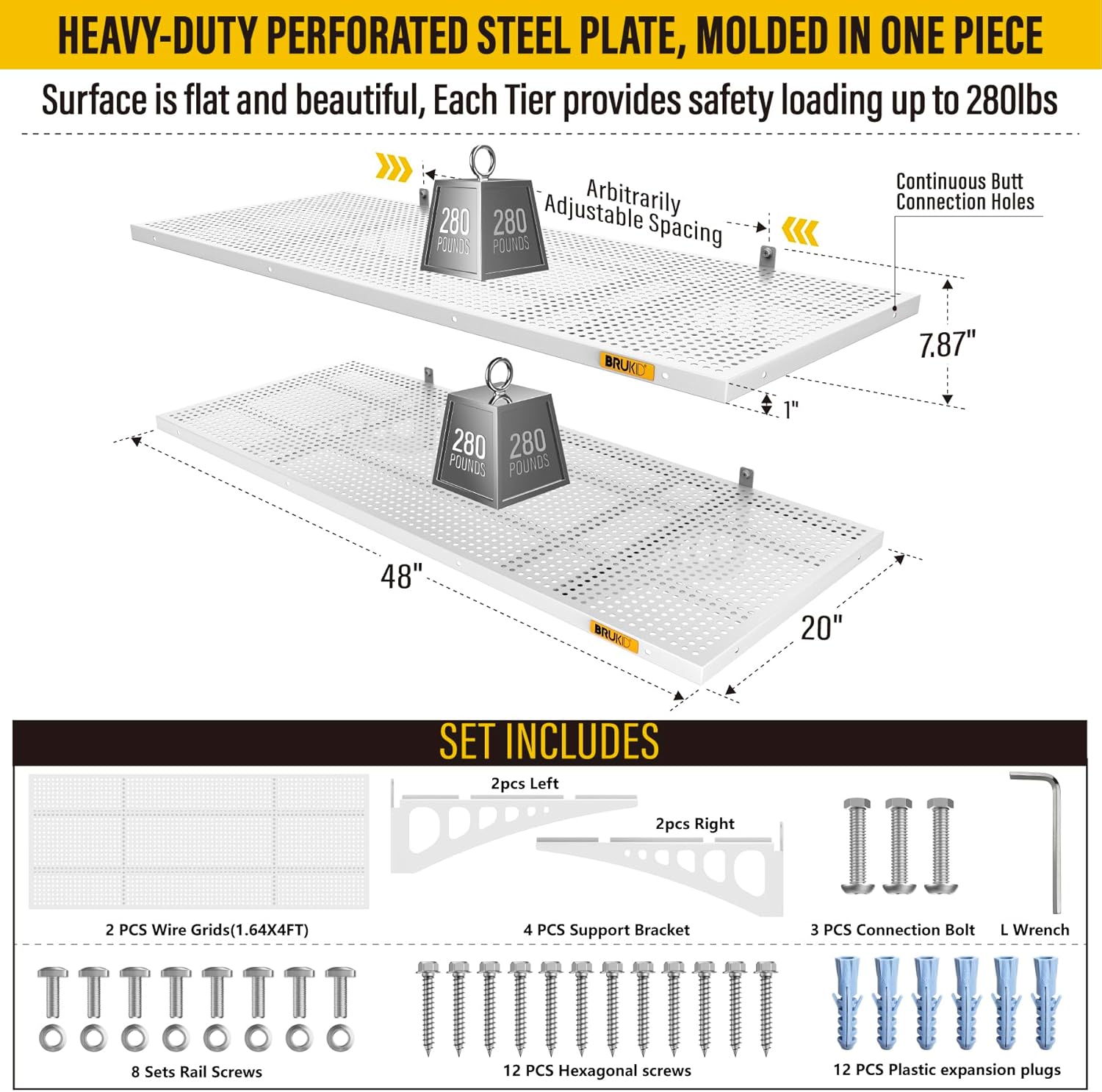 • SUPERIOR DESIGN: Wall shelf garage storage rack panel is made of whole piece of perforated steel plate bending and welding, the surface of matte high temperature powder baking paint, flat and smooth; the panel adopts slide rail design, can be adjusted by parallel left and right sliding at will; bracket can be freely installed in 45” range of the spacing of the wood wall keel, without affecting the precision connection with the panel, eliminating the worry of being unable to docking due to the mismatch of spacing points of load-bearing wood wall keel or inaccuracy of the installation of the bracket. It saves time and labor