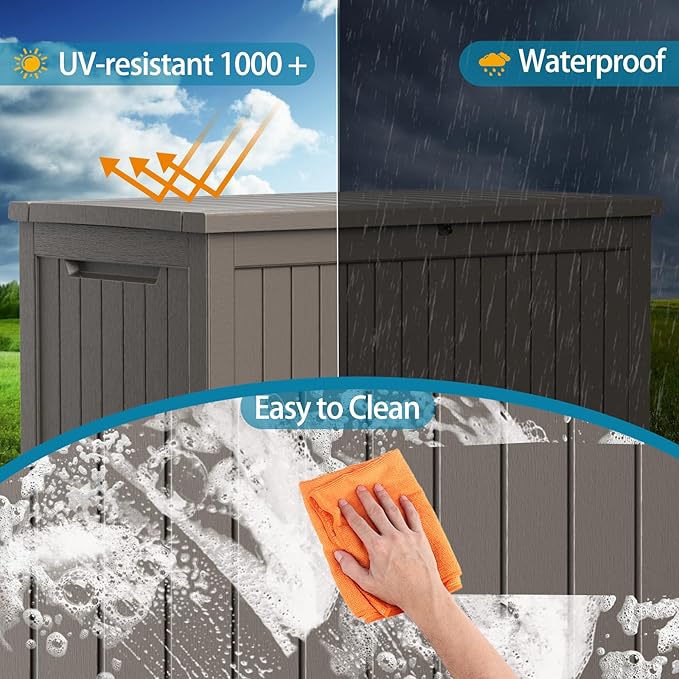 • Safety design: Each deck box has lockable holes (not included) for added security; in addition, the box is equipped with a hydraulic stand, which allows easy opening and slow closing and prevents hand pinching. The outdoor waterproof deck box has built-in handles on both sides, ensuring easy grabbing and moving.