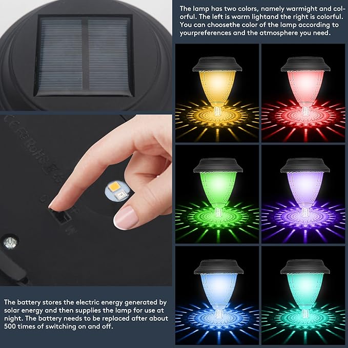 • Upgraded Solar Light: Solar light has a waterproof solar panel, built-in light sensor, have longer lighting time and brighter lighting. Simply press the button to the "ON" position at first use, automatically charges for 6-8 hours during the day and turns on automatically for 8-10 hours in the dark. Suitable for any outdoor weather conditions: sun, wind, rain, snow, frost or sleet