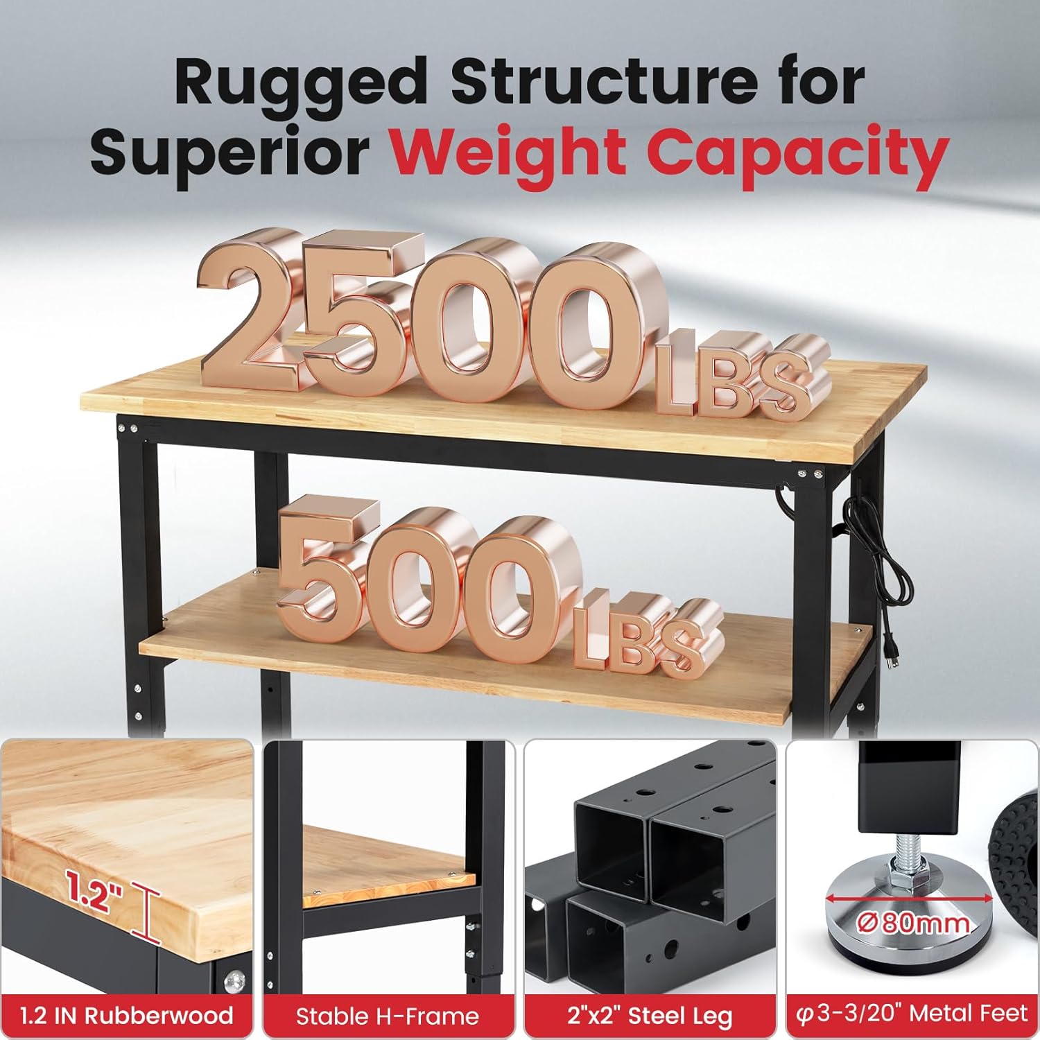 • Outstanding Strength: 𝐇-𝐬𝐡𝐚𝐩𝐞𝐝 𝐟𝐫𝐚𝐦𝐞 with upper and lower crossbar supports to improve stability and load-bearing capacity. 𝟓𝟎𝐱𝟓𝟎𝐦𝐦(𝟏.𝟐𝐦𝐦 𝐭𝐡𝐢𝐜𝐤𝐧𝐞𝐬𝐬) steel legs, ∅𝟖𝟎𝐦𝐦 metal feet bear up to 3000lbs.