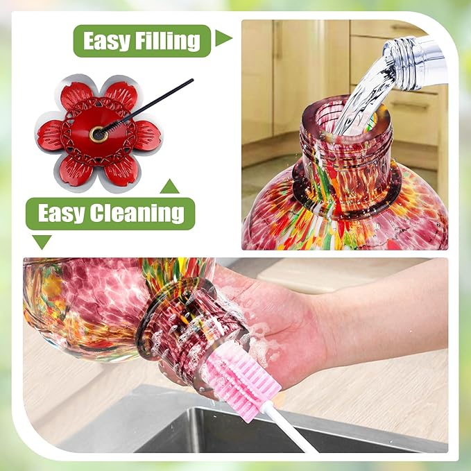 • Easy to Clean and Refill: Simply unscrew the container off the base, cleaning and refilling it will be a cinch. To ensure hummingbird feeder stays clean and well-maintained, we recommend hand washing with warm soapy water