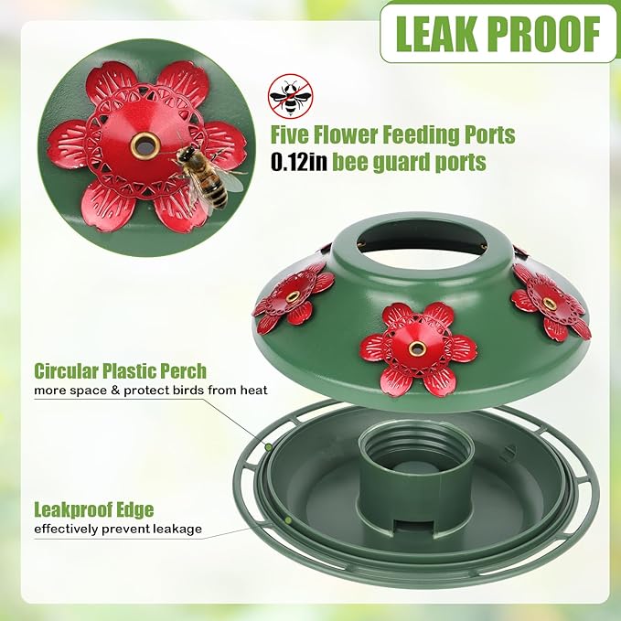 • Ample Feeding Space: Five flower shape feeding prorts are perches arranged in a circular manner for several humming birds dine and rest at the same time; Upgraded glass hummingbird feeder with 22 oz nectar capacity have perfect size to keep nectar fresh