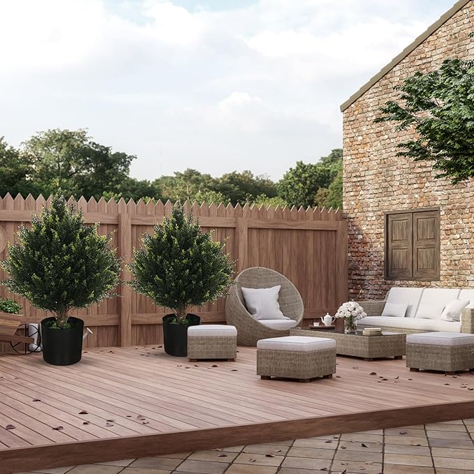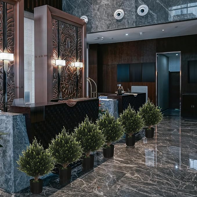 • Product size: The topiary trees artificial indoor in outdoor is19”*13”*13”, provided with a black plastic flowerpot with 4.5 inches height and 5 inches width. The height of cedar is measured from the bottom of flowerpot to the leave atop the cedar, and the width of cedar is measured from the leftmost leave to the rightmost leave,The products are made manually. It is normal to have 1 inch error in measurement. Please be prudent in buying if you mind it