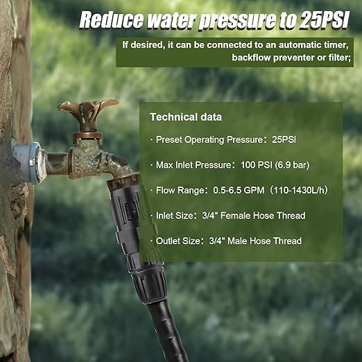 • 25 PSI Pressure Regulators: The 25 psi pressure regulator is designed to regulate and reduce water pressure, ensuring optimal performance for your drip irrigation system. Suitable for standard 3/4" outdoor faucets, water hoses, irrigation systems, etc.