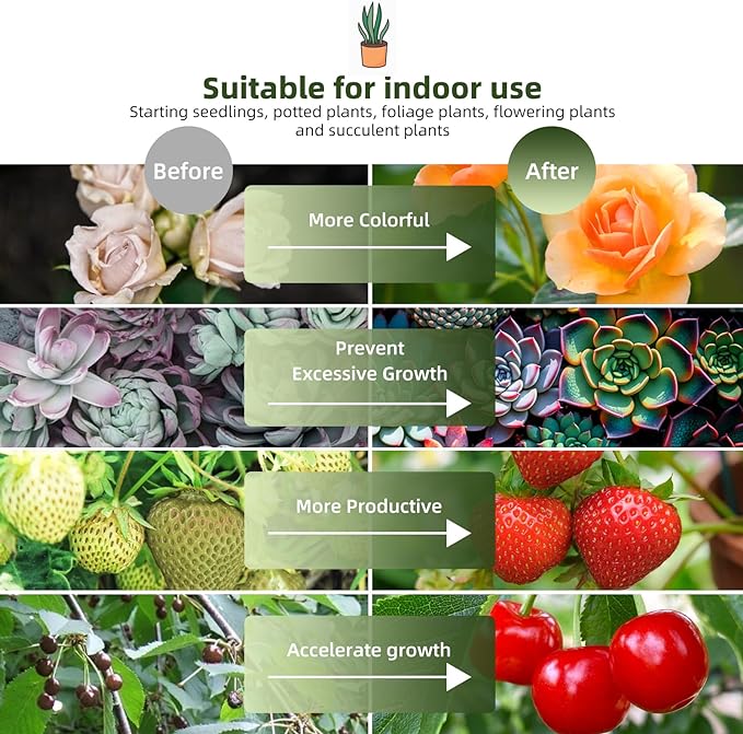 • [Widely Application]: Suitable for use in shelves-plants, greenhouse, potted, catcus, kitchen, bathroom, grow box, darkroom. Especially in places with insufficient sunshine in winter.The grow light fixture with high PPFD can be used for seed starting, flowering and fruiting.