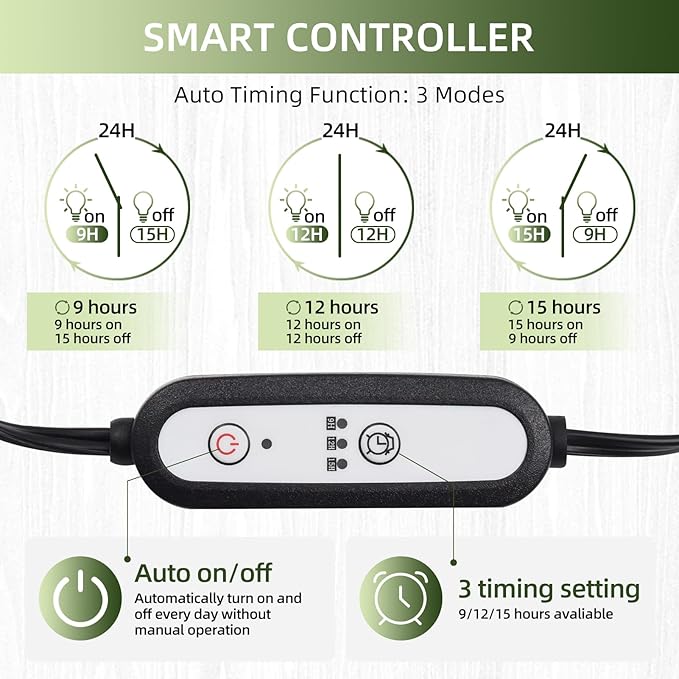 • 【Auto Turn On/Off Timer Everyday】: This plant growth light offers three cycle timing settings. It can remain on for 9, 12, or 15 hours, and then turn off for 15, 12, or 9 hours, respectively. Furthermore, it will automatically turn on and off at the same time every day.. This light provides a convenient way to ensure your plants receive proper care, even when you are away at work or on vacation.