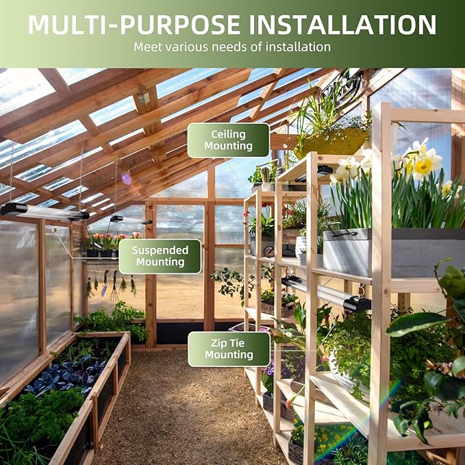 • 【Easy Installation & Safe】: These grow lights can be installed in a variety of ways to meet the needs of various installation environments. Equipped with screws, hooks,chains, zip ties and brackets.