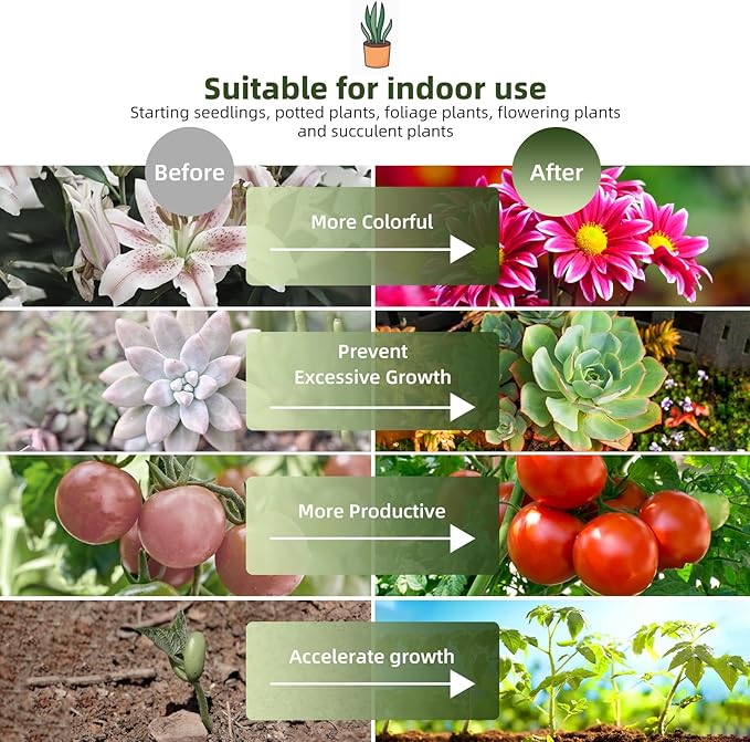 • 【Widely Application】: Suitable for use in shelves-plants, greenhouse, potted, catcus, kitchen, bathroom, grow box, darkroom. Especially in places with insufficient sunshine in winter.The grow light fixture with high PPFD can be used for seed starting, flowering and fruiting.
