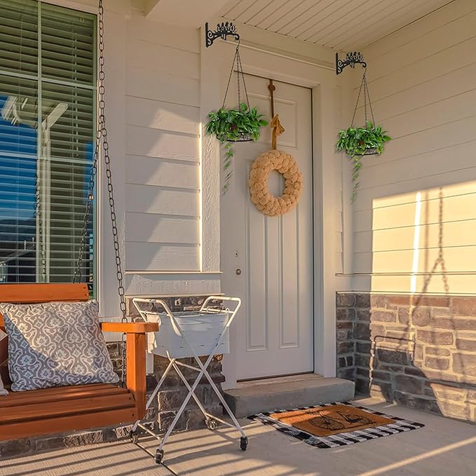 • DURABLE AND ANTI-RUST - Crafted from heavy-duty iron, our 10-inch hanging plant bracket features an 2 mm thick body and 2 cm wide base to ensure no deformation even with heavy flower pots in windy conditions (max load 30 lb). The anti-rust coating ensures long-lasting durability, making it ideal for both window plant hanger indoor and plant hangers outdoor.