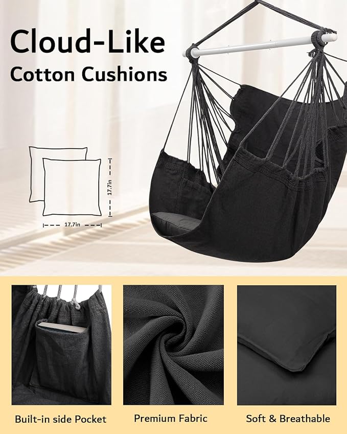 • HEAVY-DUTY DESIGN: Unlike other hanging rope loungers that can only accommodate up to 330 lbs, our hammock chair swing for bedroom is tested and rated by SGS with a max. load of 500 lbs. When it comes to your family's safety, choose this ultra-strong swing chair instead of other fragile outdoor hammock chairs