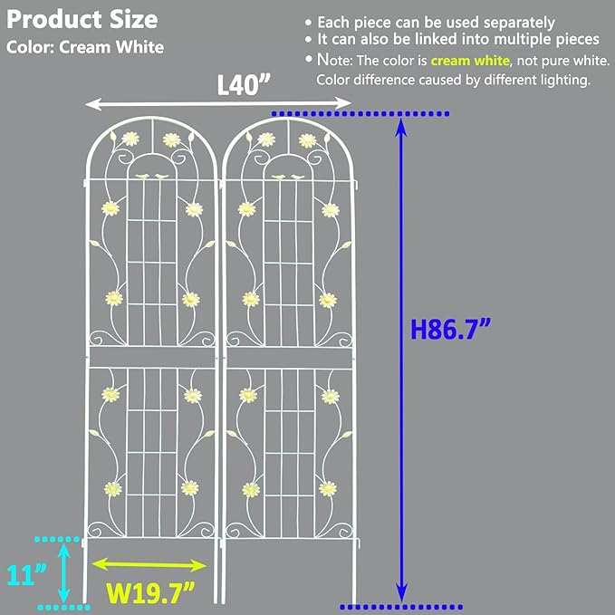 • Plants Supporting Trellis: This Cream White metal garden trellis is perfect for supporting all kinds of flowering trellis plants, wall-climbing vines. It allows them to grow naturally up towards the top.
