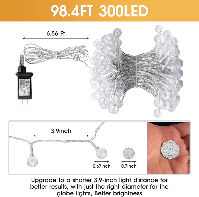 • Commercial quality string lights: The globe around the lights are shatterproof because they are made out of plastic. 300 led bulbs give off a warm white light. An ul listed power adapter comes with the lights,and the spacinga between bulbs is 3.94 inches