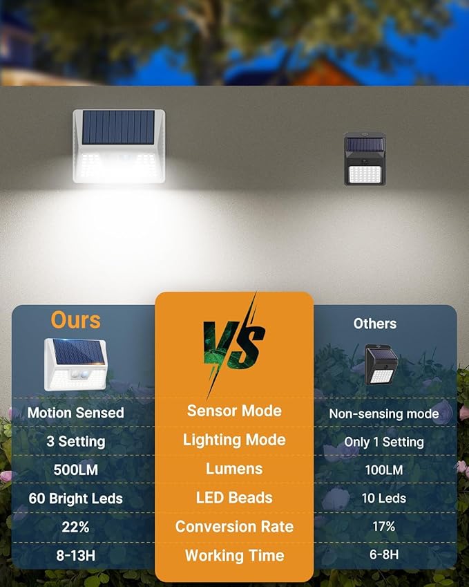 • 【Faster Charging-Longer Lighting】:This solar motion activated security light boasts a supercharged solar panel with a 20-22% conversion rate, meaning it charges up quicker during the day. That translates to longer illumination at night, keeping your outdoor space brightly lit for enhanced safety and security